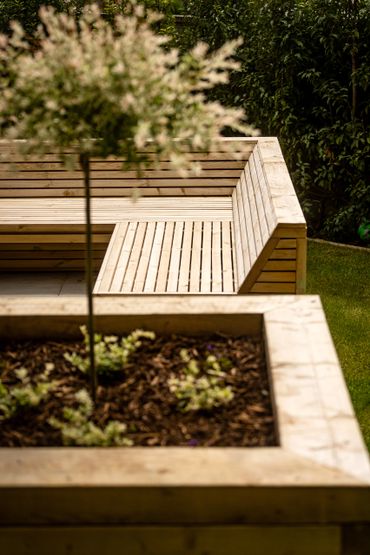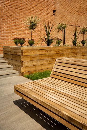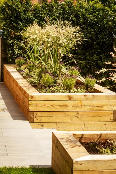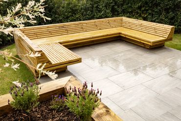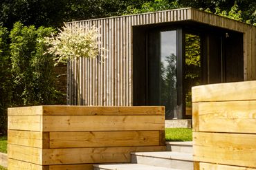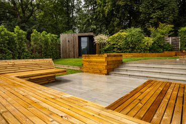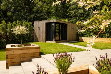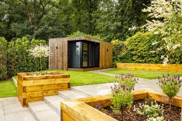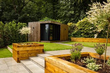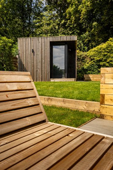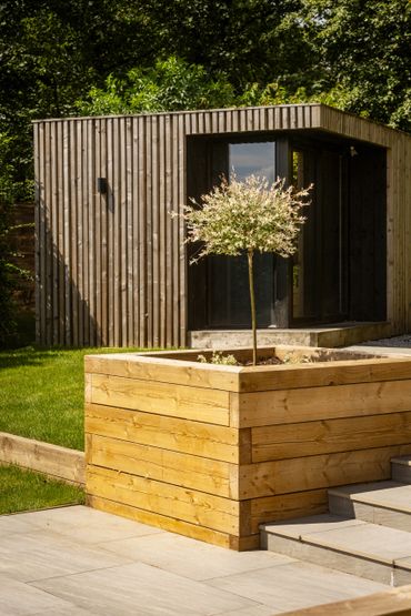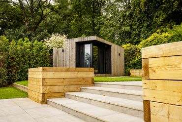 Working from home could not be more stylish and enjoyable with this outdoor office we designed and built. The outdoor seating, planters, flagging and steps create the perfect space to relax when the working day is done and it's time to enjoy this beautiful garden with your family.