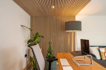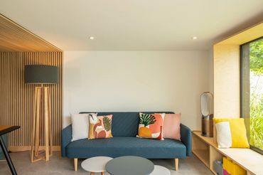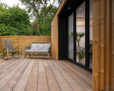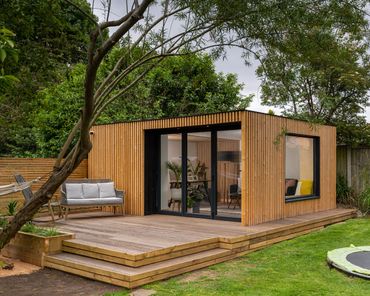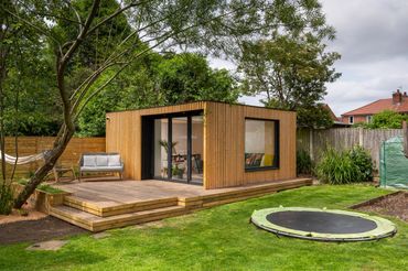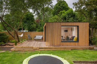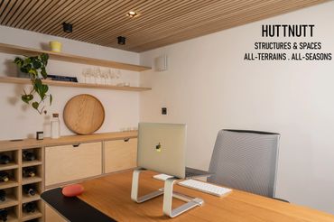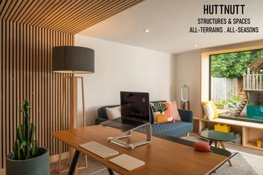 We design your interiors to complement the exterior theme of the build. Here we cladded the interior office area of the build with bespoke birch wood seamlessly merging the style and seperating the work and relaxation areas of the build. We love the customers stylish furnishing choices adding a beautiful finish.
